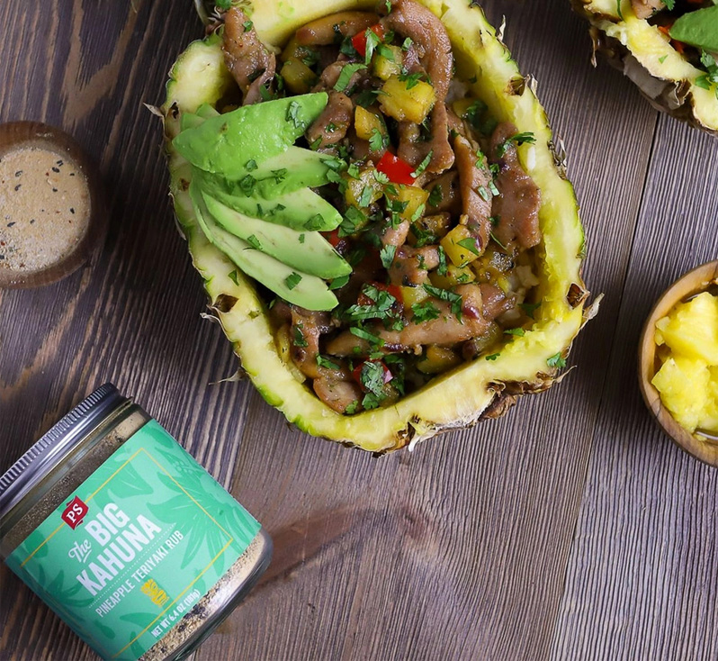 Big Kahuna – Pineapple Teriyaki Rub delivers sweet tropical pineapple flavor with savory teriyaki depth. It caramelizes under heat and adds glossy color to pork, chicken, seafood, and vegetables without overpowering natural taste.